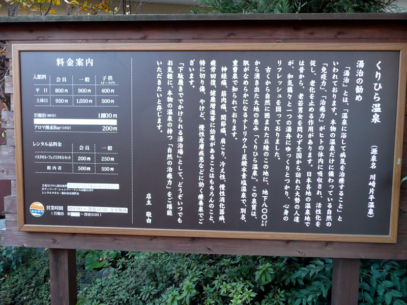 「ツール・ド・銭湯2011」第9ステージは11月18日(金)、前回と同じく日帰り温泉である。今回の目的地は「野天湯元 湯快爽快 くりひら」。神奈川県川崎市麻生区にある入浴施設である。