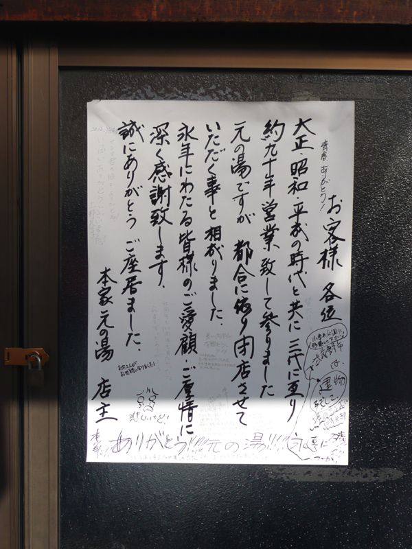 右の写真は扉に貼られた廃業を知らせる貼り紙。余白に常連客などからのものと思われるメッセージがいくつか書き込まれている。