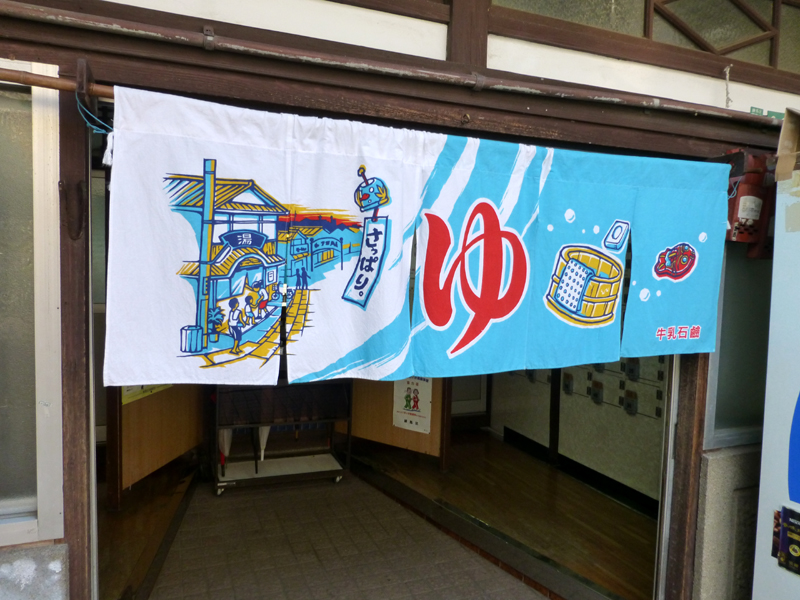 戻って関の湯の暖簾をくぐる。暖簾は銭湯のある街並を描いたもので、夏らしいデザイン。初めて見るものだ。