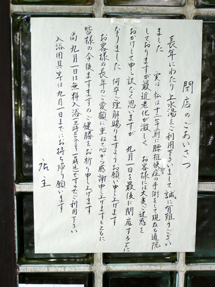 文面からは浴場主さんのやむにやまれぬ心情が伝わってくる。お会いしたことはないがご高齢であろう。一般に重労働であると言われる銭湯の仕事を痛みに耐えながら続けておられたかと思うと、「お疲れ様でした」という言葉では到底足りない。