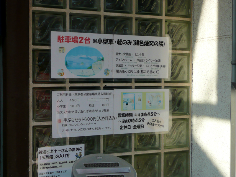 クリーム色の庇に赤い文字と、入口の両脇にある縮小版のペンキ画が外観の特徴だ。建物は木造の戸建だが2階部分は住居になっている。建物の右側を見ると、2階に上がるための階段があり、上り口には集合住宅用の郵便受けがある。天狗湯はマンション銭湯ならぬアパート銭湯(略して「アパ銭」?)なのだ。